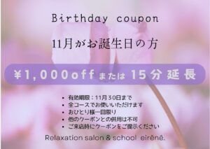 ささやかですが、イレーネよりバースデークーポンをプレゼントいたします💕