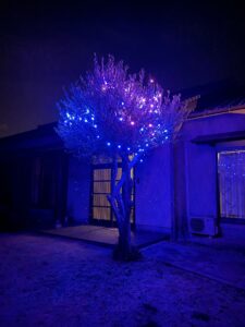 先日、サロン玄関の剪定したオリーブの木をイルミネーションで飾りました。